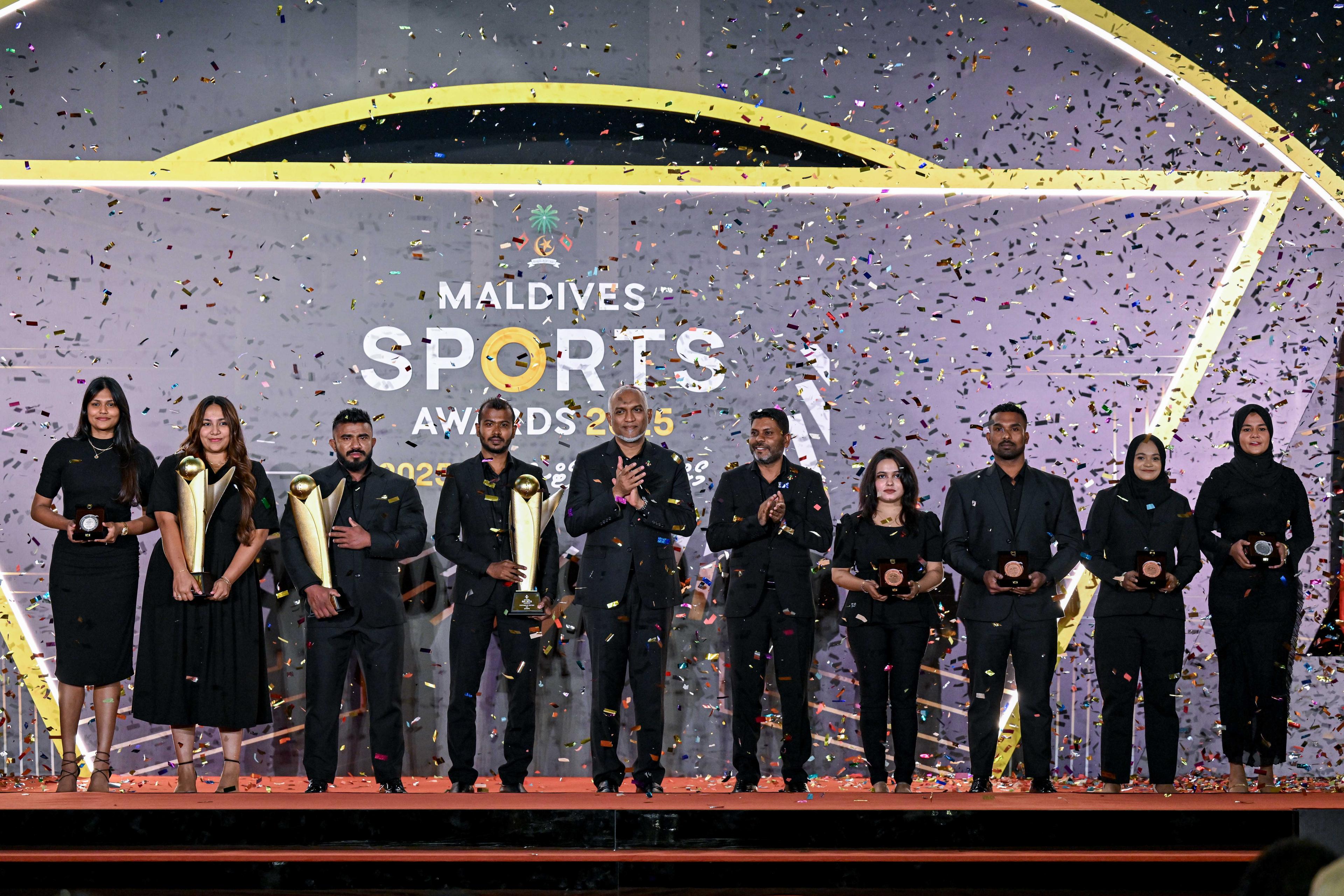 ރައީސުލްޖުމްހޫރިއްޔާ ޑޮކްޓަރ މުޙައްމަދު މުޢިއްޒު، މޯލްޑިވްސް ސްޕޯޓްސް އެވޯޑްސް 2025 ގެ ޝަރަފުވެރި އެވޯޑުތައް ހަވާލުކޮށްދެއްވައިފިއެވެ.