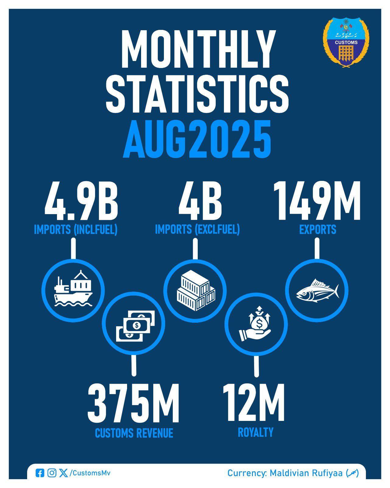ކަސްޓަމްސްއިން މިއަދު އާންމުކުރި ތަފާސްހިސާބުތަކުން ދައްކާ ގޮތުގައި، މިދިޔަ މަހު ރާއްޖެއަށް އެތެރެކުރި 4.9 ބިލިއަން ރުފިޔާގެ ތަކެތީގެ ތެރެއިން 873 މިލިއަން ރުފިޔާއަކީ ޕެޓްރޯލާއި ޑީސަލެވެ. އަދި، ކަސްޓަމްސްއަށް އާމްދަނީގެ ގޮތުގައި 375 މިލިއަން ރުފިޔާ ލިބުނުއިރު ރޯޔަލްޓީ ފީގެ ގޮތުގައި 12 މިލިއަން ރުފިޔާ ލިބުނު ކަމަށް ވެސް އެ ހިސާބުތަކުގައިވެއެވެ.