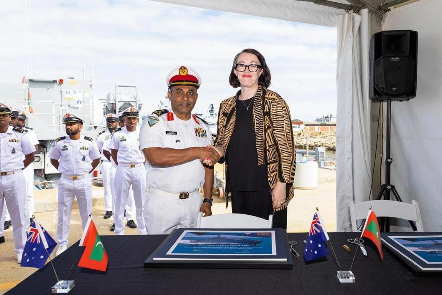 އޮސްޓްރޭލިއާގެ ޕާތުގައި ހުންނަ އެޗްއެމްއޭއެސް ސްޓާލިންގ ނޭވަލް ބޭސްގައި ބޭއްވި ރަސްމިއްޔާތު ޝަރަފުވެރިކޮށްދެއްވީ ރޯޔަލް އޮސްޓްރޭލިއަން ނޭވީގެ ރިއަރ އެޑްމިރަލް ބްރެޓް ސޮންޓާއާއި، އެމްއެންޑީއެފް ކޯސްޓްގާޑުގެ ކޮމަޑާންޓް، ބްރިގޭޑިއަރ ޖެނެރަލް މުޙައްމަދު ސަލީމެވެ.
